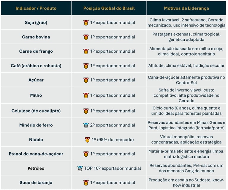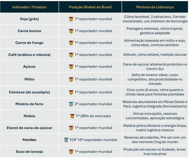 líder mundial em produção de alimentos, minérios estratégicos (como nióbio e lítio), e superalimentos.